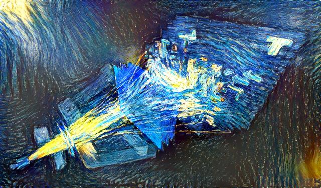 This picture is constructed as LHCb event display that has passed through popular Deep Learning algorithm - Style Transfer - that borrows the style from Van Gogh’s ‘Starry Night’ (https://github.com/jcjohnson/neural-style). So it is somewhat metaphorically related to the nature of the talk (learning algorithms for HEP problems borrowed from other domains).